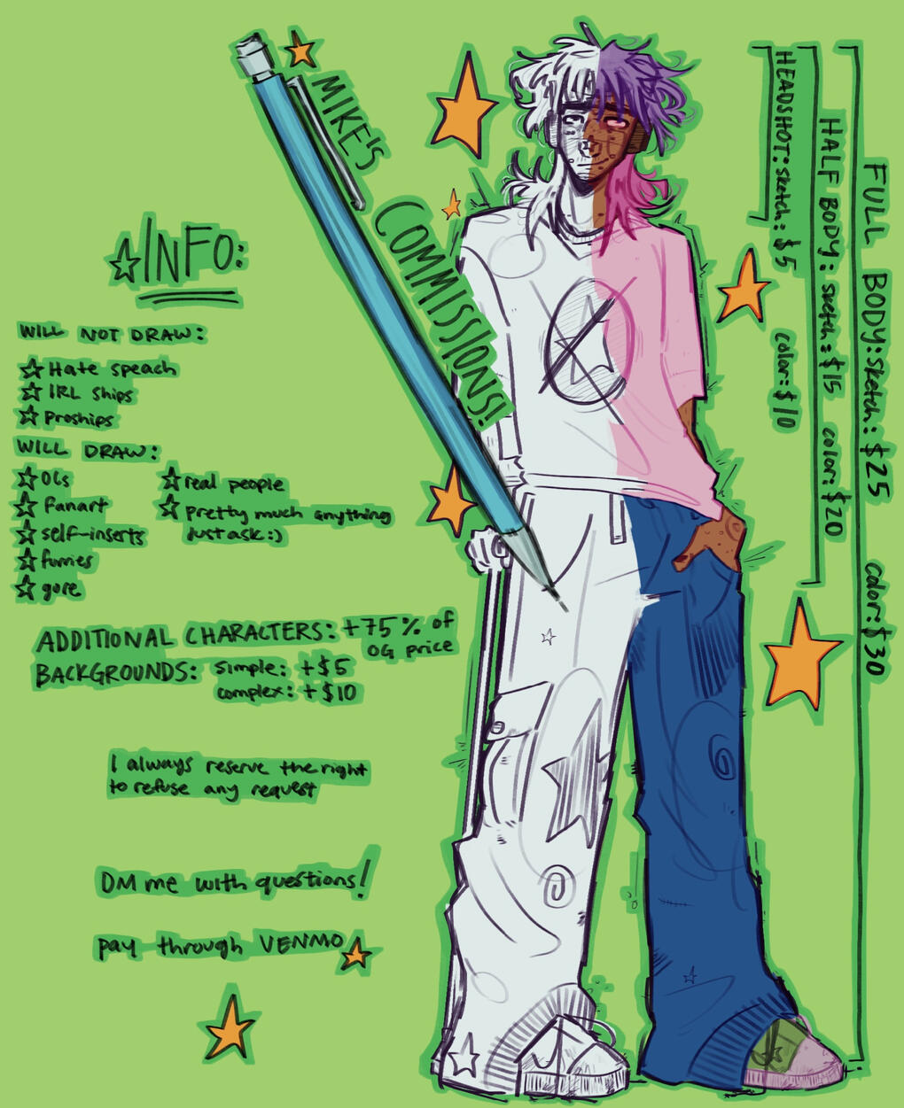 prices and examples are below, also my contact info at the bottom :))btw i’m willing to negotiate prices idc i’ll probably draw whatever for cheap haha i like to draw 🤷♂️